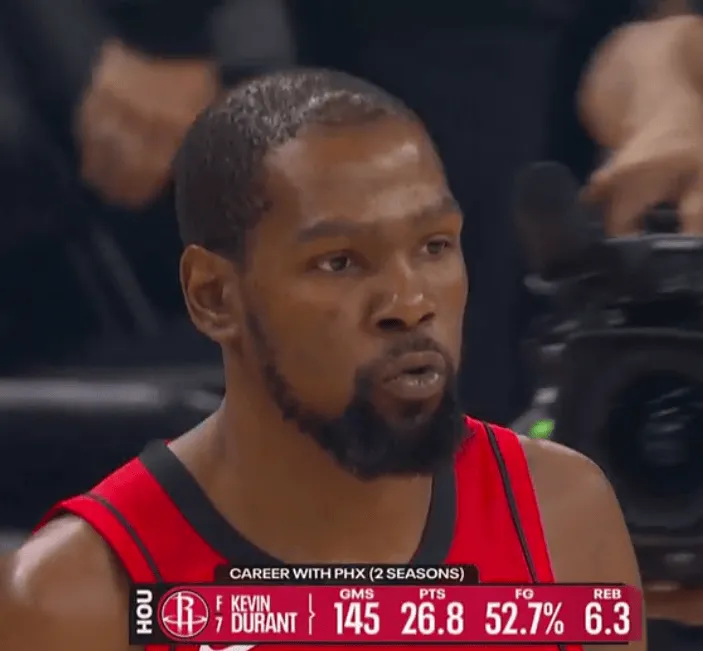 火箭半场54-57落后太阳,杜兰特11分&布克21分。